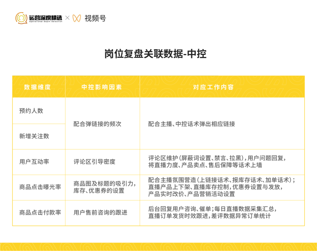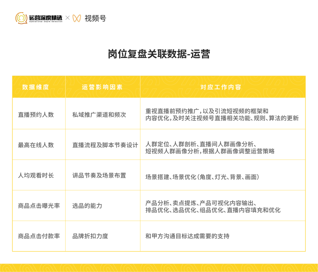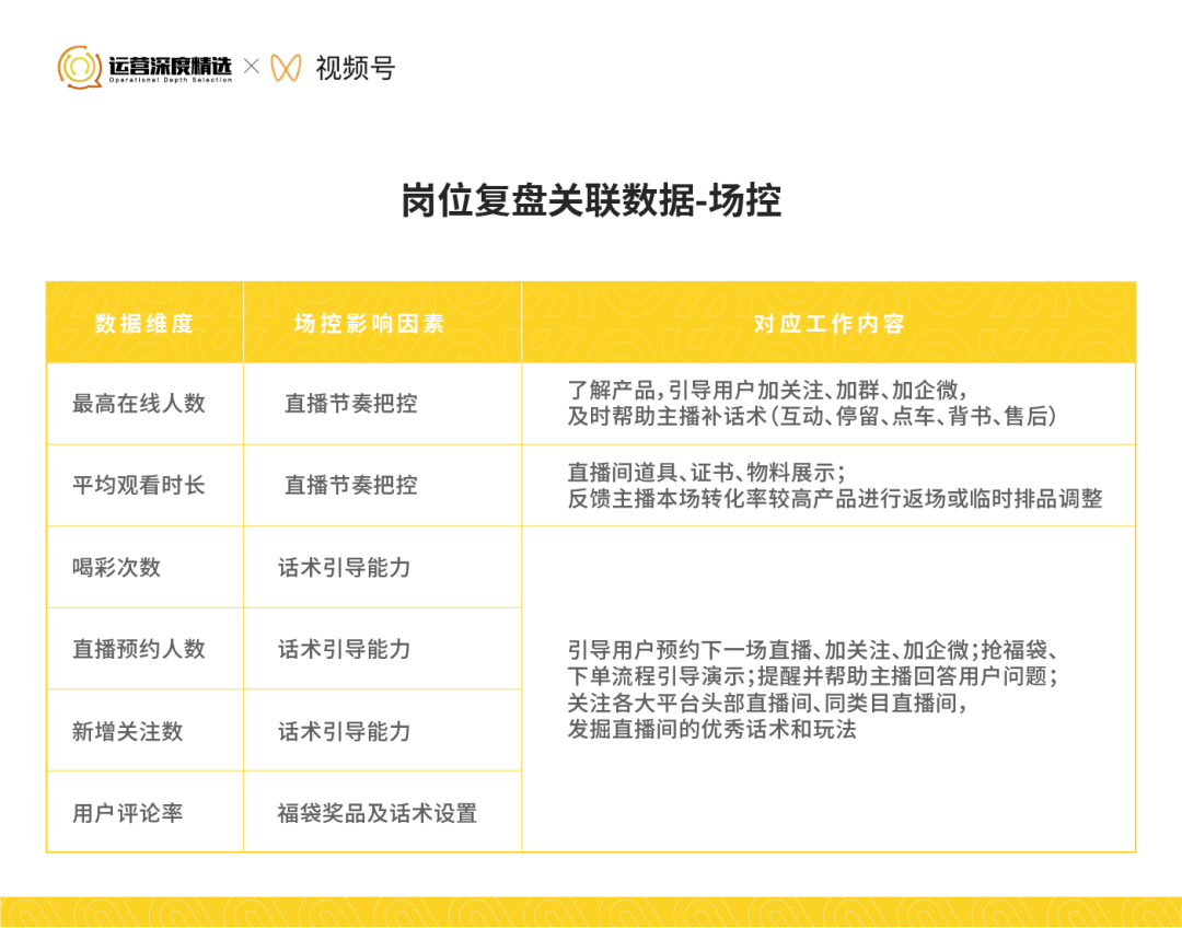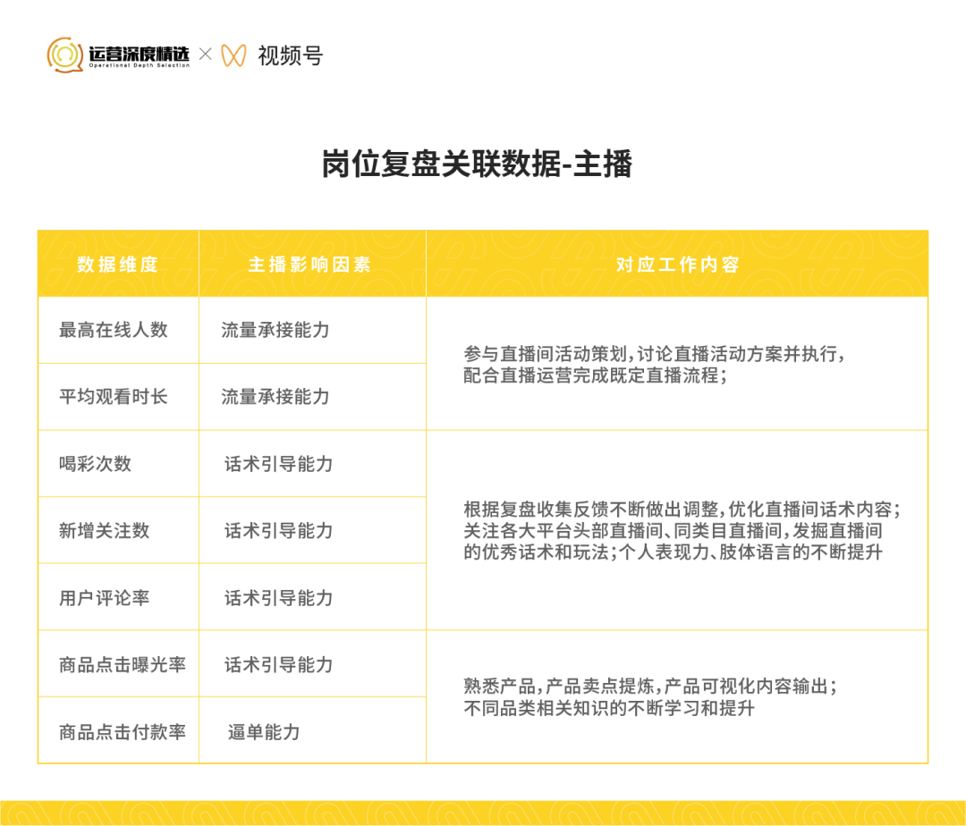 通過(guò)這3步,基本可以盤(pán)點(diǎn)出一場(chǎng)直播全局的問(wèn)題點(diǎn),和往期數(shù)據(jù)對(duì)比中去提升、成長(zhǎng)。另外,這里也提供一份官方給出的、視頻號(hào)直播大盤(pán)的各維度數(shù)據(jù)均值和最佳實(shí)踐值,可以有一個(gè)「外部」大盤(pán)視角的對(duì)比,不過(guò)也僅供參考:(目前視頻號(hào)直播大盤(pán)數(shù)據(jù)指標(biāo)——來(lái)源于騰訊智慧零售)上方表格中的分享率、互動(dòng)率、商品點(diǎn)擊率、交易額等數(shù)據(jù)都很高,想要做到均值有一定難度。建議大家在與自己目標(biāo)及過(guò)往的數(shù)據(jù)對(duì)比中,做到每場(chǎng)都進(jìn)步一點(diǎn)點(diǎn),積跬步、至千里。緊接著再往下一步,我們就該通過(guò)以上分析出的全局問(wèn)題點(diǎn),來(lái)關(guān)聯(lián)對(duì)應(yīng)的每個(gè)崗位,做更細(xì)致的復(fù)盤(pán)分析,解決問(wèn)題、梳理出對(duì)應(yīng)方案。02 運(yùn)營(yíng)復(fù)盤(pán)