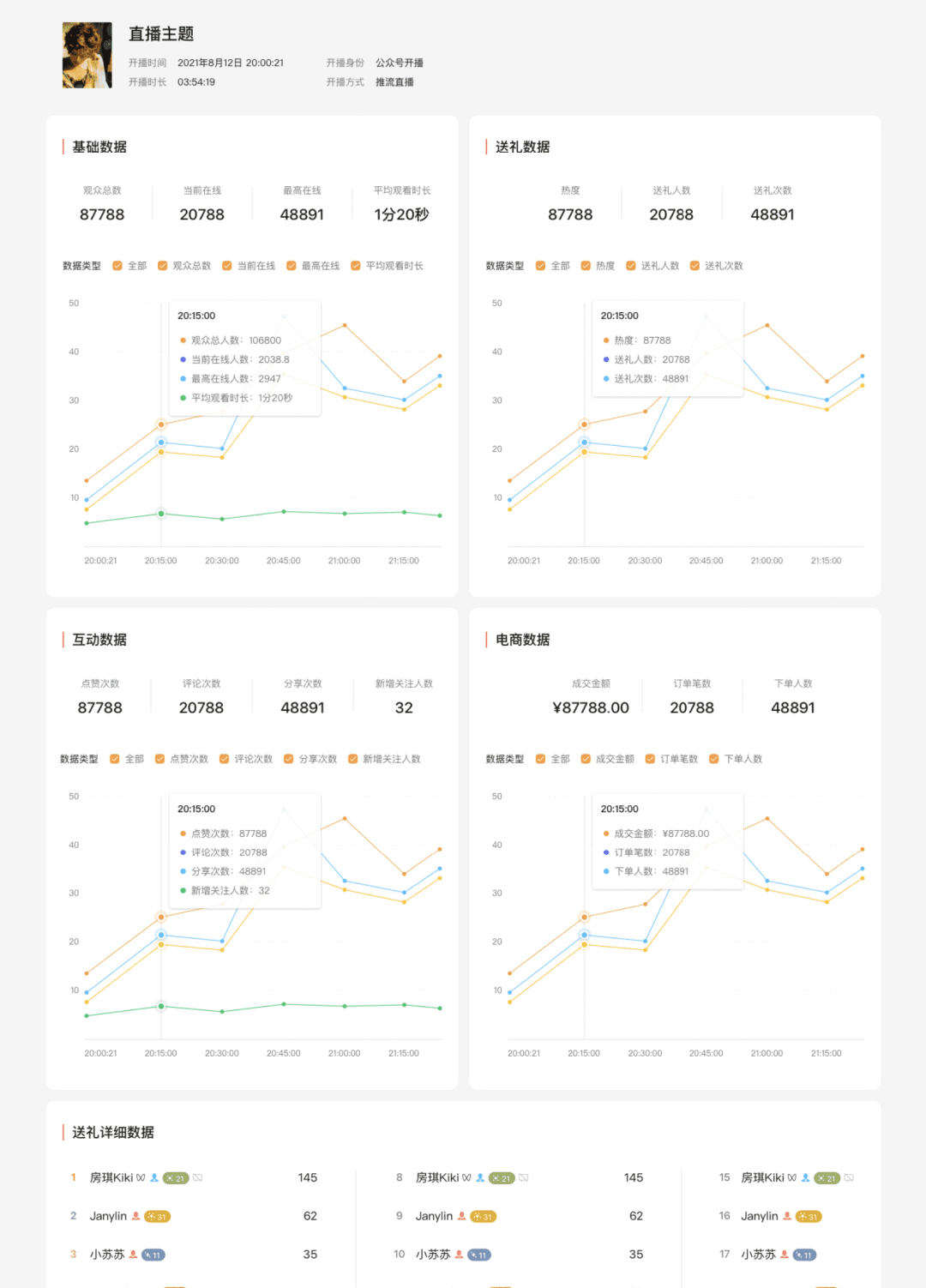 這里值得插一句,過(guò)往由于視頻號(hào)直播相關(guān)基建都還在建設(shè)中,以上各維度的數(shù)據(jù)我們是用第三方工具采集整理。不過(guò)就在梳理這篇文章的過(guò)程中,視頻號(hào)更新了PC端后臺(tái)的數(shù)據(jù)看板功能,可查看直播實(shí)時(shí)數(shù)據(jù)趨勢(shì),并支持直播結(jié)束后查看。這個(gè)功能更新對(duì)運(yùn)營(yíng)者來(lái)說(shuō)很贊,數(shù)據(jù)監(jiān)測(cè)的準(zhǔn)確率也會(huì)大大提高。(更新后的視頻號(hào)助手后臺(tái)數(shù)據(jù)看板,可查看更多維度數(shù)據(jù))介紹完這次更新,我們繼續(xù),下一步就到分析數(shù)據(jù)的環(huán)節(jié)了。我們通常會(huì)先沿著 目標(biāo)回顧、單場(chǎng)分析、橫向?qū)Ρ?/strong> 這3步來(lái)看走,即:回顧本場(chǎng)各項(xiàng)數(shù)據(jù)與目標(biāo)的差距,重點(diǎn)聚焦本期的數(shù)據(jù)趨勢(shì)表現(xiàn),同時(shí)橫向?qū)Ρ韧谥辈ラg數(shù)據(jù),最終明確本場(chǎng)直播的整體數(shù)據(jù)表現(xiàn)。- 目標(biāo)回顧時(shí),拿出運(yùn)營(yíng)在直播前的活動(dòng)方案中制定的單場(chǎng)目標(biāo),包括每項(xiàng)觀看&互動(dòng)數(shù)據(jù)和商品&交易數(shù)據(jù),對(duì)比后臺(tái)的實(shí)際數(shù)據(jù),查找目標(biāo)達(dá)成或未達(dá)成項(xiàng)的主要原因,明確實(shí)際情況與目標(biāo)預(yù)估的差距。