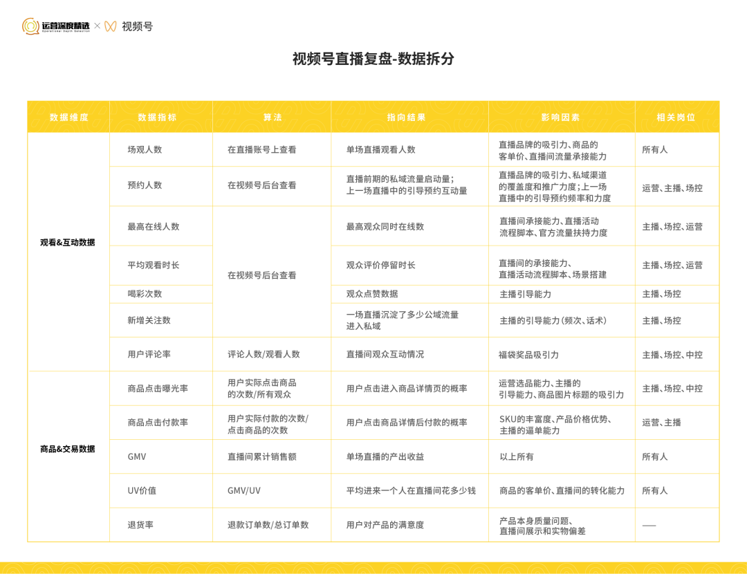 那一場(chǎng)復(fù)盤(pán)又該從何切入?「數(shù)據(jù)」無(wú)疑是最客觀的評(píng)分。無(wú)論過(guò)程中直播間里有多火熱,最終的各項(xiàng)數(shù)據(jù)都是用戶(hù)「用腳投票」后最真實(shí)的反饋。同時(shí),我們的數(shù)據(jù)維度不只圍繞于其他平臺(tái)直播間的那些「直播間內(nèi)數(shù)據(jù)」,和私域各觸點(diǎn)在「流量導(dǎo)入」與「流量沉淀」的數(shù)據(jù),也是需要重點(diǎn)分析的。我們的目的從來(lái)不是只做好視頻號(hào)直播,而是要通過(guò)視頻號(hào)直播實(shí)現(xiàn)整體私域的提效。那么具體都有哪些數(shù)據(jù)可以展開(kāi)?如何讓數(shù)據(jù)關(guān)聯(lián)到各個(gè)崗位的動(dòng)作,由此分析問(wèn)題產(chǎn)生的原因,并提煉經(jīng)驗(yàn),指導(dǎo)直播間下一步的策略調(diào)整?01 視頻號(hào)直播各崗位相關(guān)數(shù)據(jù)依照這個(gè)復(fù)盤(pán)思路,我們把一場(chǎng)直播的所有相關(guān)數(shù)據(jù)列在了一張表里:(視頻號(hào)直播各崗位相關(guān)數(shù)據(jù))