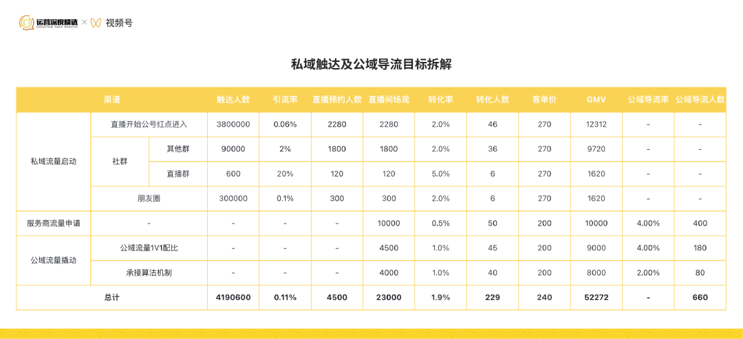 除開(kāi)以上提到的各崗位復(fù)盤(pán)外,還有最重要的一項(xiàng)復(fù)盤(pán),就是直播和私域團(tuán)隊(duì)的協(xié)作配合。對(duì)于不少品牌來(lái)說(shuō),做視頻號(hào)直播首先要考慮的就是如何跟已有業(yè)務(wù)結(jié)合,而視頻號(hào)的流量機(jī)制及所處生態(tài)決定了其必然離不開(kāi)私域團(tuán)隊(duì)的配合。如何把視頻號(hào)直播作為品牌私域更高效的轉(zhuǎn)化方式,也是我們目前在幾個(gè)不同品類(lèi)視頻號(hào)直播間測(cè)試的方向。這當(dāng)中常見(jiàn)具體問(wèn)題有:運(yùn)營(yíng)在直播前該和私域團(tuán)隊(duì)制定什么樣的推廣指標(biāo)?而在直播中又該往私域引流多少新用戶(hù)?怎樣的節(jié)奏才合理?私域用戶(hù)在直播中產(chǎn)生的相關(guān)問(wèn)題如何解決?原有的小程序商城如何和視頻號(hào)直播打通......這些問(wèn)題都涉及到了直播團(tuán)隊(duì)如何和私域團(tuán)隊(duì)更好地協(xié)作配合,也是過(guò)往品牌在抖音等其他平臺(tái)自播時(shí)不會(huì)遇到的新問(wèn)題。對(duì)于這些問(wèn)題的思考復(fù)盤(pán),也更有必要和意義。目前我們直播團(tuán)隊(duì)和私域團(tuán)隊(duì)的配合會(huì)從制定目標(biāo)開(kāi)始,明確一場(chǎng)視頻號(hào)直播的「私域觸達(dá)???????????????????」和「公域引流」指標(biāo),并根據(jù)過(guò)往轉(zhuǎn)化率進(jìn)行細(xì)致地拆分,方便在直播結(jié)束后對(duì)應(yīng)目前達(dá)成情況來(lái)具體復(fù)盤(pán)分析原因。(直播前的目標(biāo)拆解,數(shù)據(jù)僅供參考)