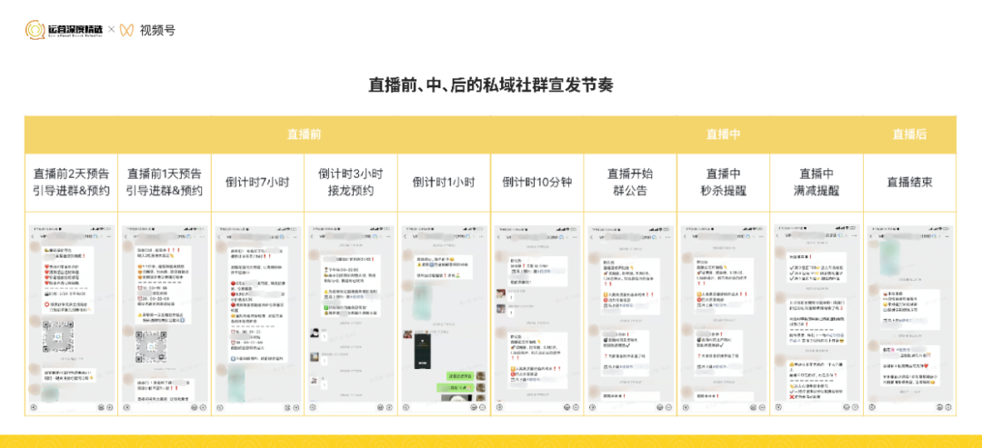在直播間推廣問(wèn)題上,直播團(tuán)隊(duì)也會(huì)和私域團(tuán)隊(duì)提前溝通,制定出詳細(xì)的直播前、中、后推廣節(jié)奏,如下圖所示,在一場(chǎng)直播前會(huì)有6次倒計(jì)時(shí)提醒,直播中有3次節(jié)點(diǎn)性提醒,直播后還會(huì)引導(dǎo)用戶(hù)參與直播相關(guān)討論,其中的文案和配圖也都會(huì)在一場(chǎng)直播前就全部確定。