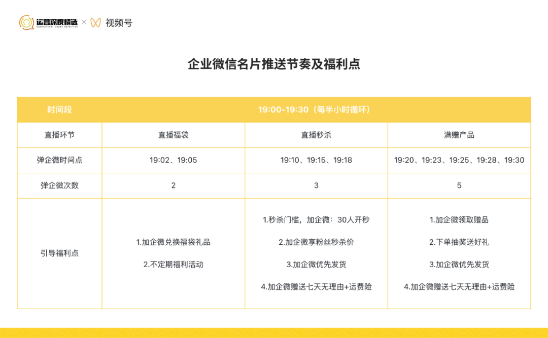 同時(shí),在直播后和私域團(tuán)隊(duì)的復(fù)盤(pán)中,我們也會(huì)共創(chuàng)對(duì)應(yīng)解決辦法,比如在直播中彈出企微名片引導(dǎo)用戶(hù)添加這個(gè)動(dòng)作,我們會(huì)細(xì)化到以半小時(shí)為一個(gè)循環(huán),一個(gè)循環(huán)中包括直播福袋、直播秒殺、滿(mǎn)減產(chǎn)品3個(gè)推送節(jié)點(diǎn),共10次引導(dǎo)動(dòng)作,每次都會(huì)用不同的福利點(diǎn)來(lái)場(chǎng)景化引導(dǎo)用戶(hù)添加。(直播前會(huì)和私域團(tuán)隊(duì)針對(duì)直播中的推送節(jié)奏和福利點(diǎn)做規(guī)劃)