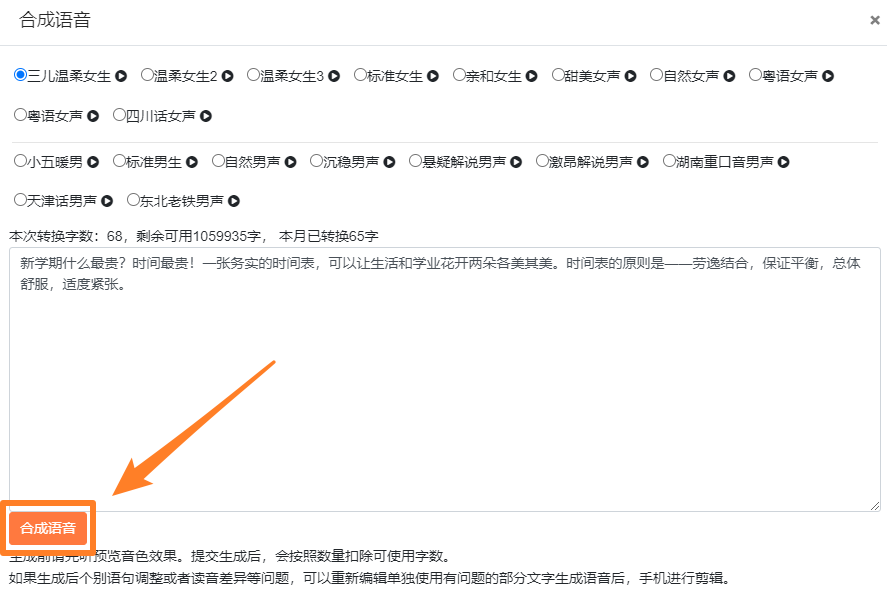注意:生成前請先聽預覽音色效果。提交生成后,會按照數(shù)量扣除可使用字數(shù)。