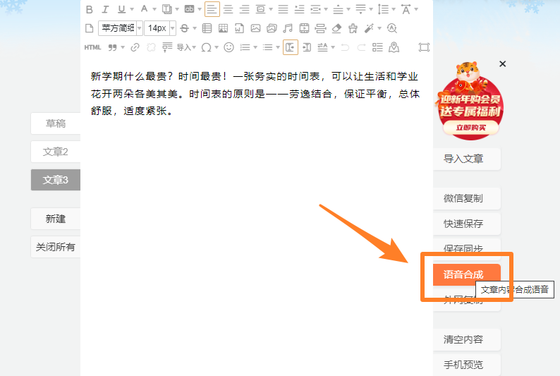 2、點擊編輯區(qū)右側的【語音合成】按鈕,進入語音合成設置界面。