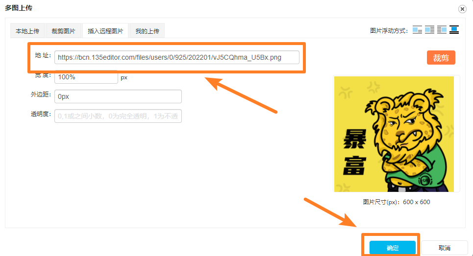 4、在換圖設(shè)置中,選擇「插入遠(yuǎn)程圖片」,將在公眾號(hào)復(fù)制來(lái)的圖片地址覆蓋粘貼到「地址」一欄中,點(diǎn)擊確定。
