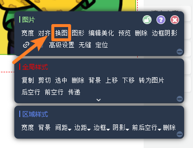3、進(jìn)入135編輯器,選中文章中同步失敗的圖片,打開全局設(shè)置中的「換圖」。