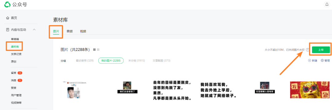 2、打開微信公眾號(hào)后臺(tái),在【素材庫(kù)-圖片】中點(diǎn)擊【上傳】按鈕,將這張同步失敗的圖片上傳到素材庫(kù)中。