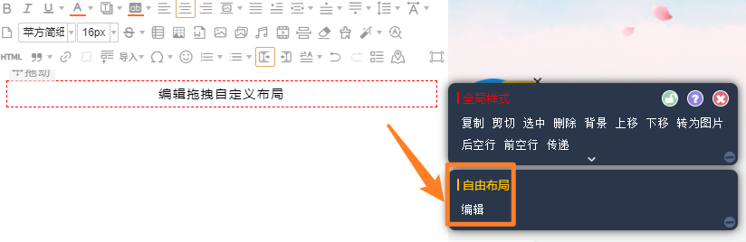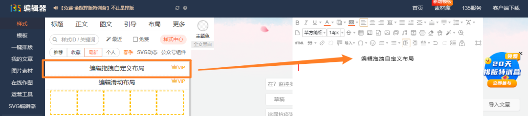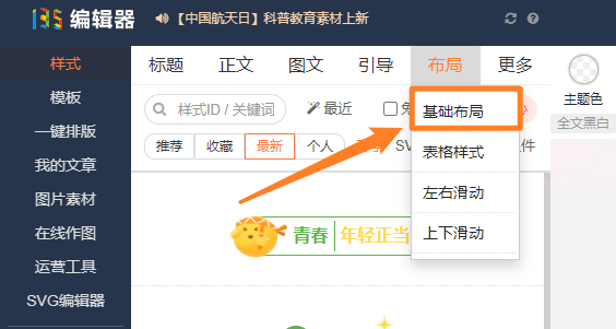?在樣式欄中選擇【布局】-【基礎布局】,選擇點擊【編輯拖拽自定義布局】,將自定義布局添加到編輯區(qū)域;