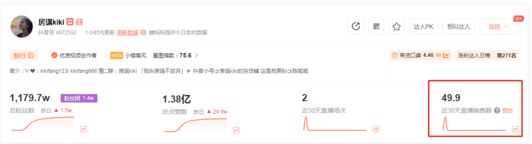 根據(jù)數(shù)據(jù)統(tǒng)計(jì),@房琪kiki在3個(gè)月內(nèi)僅直播了一場(chǎng),然后當(dāng)天直播的銷售額只有49.9元。