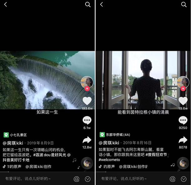 這些定位有景區(qū)的,有某個(gè)旅游小鎮(zhèn)的,@房琪kiki會(huì)通過(guò)在作品中介紹這些景點(diǎn)或旅游小鎮(zhèn),最后@出這些景點(diǎn)來(lái)進(jìn)行推廣。