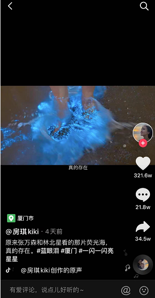 這種文案可以是勵(lì)志、共情等,讓粉絲看完之后覺得說(shuō)的非常對(duì),例如@房琪kiki發(fā)布的這條“廈門藍(lán)眼淚”視頻:“原來(lái)張萬(wàn)森和林北星看的那邊熒光海,真的存在?!?/span>