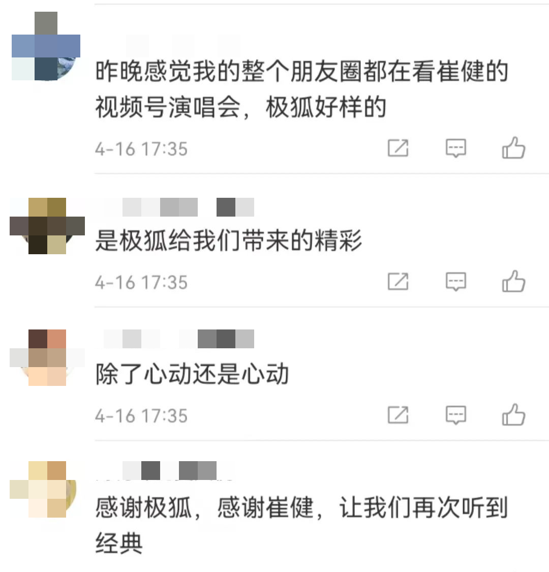 4月15日,當61歲的崔健戴著紅星白帽站在舞臺上,仍以踩在記憶上的靈魂吶喊,引發(fā)了千萬網(wǎng)友的共情同鳴。很多網(wǎng)友表示:“聽了他三十年,崔健,還是那個崔健?!?/span>這場線上演唱會,不僅重現(xiàn)了崔健的經(jīng)典曲目,對冠名品牌而言,同樣也是一場名利雙收的“完美營銷”。在極狐官方微博下,網(wǎng)友紛紛留言,“感謝極狐帶來的精彩,除了心動還是心動”。