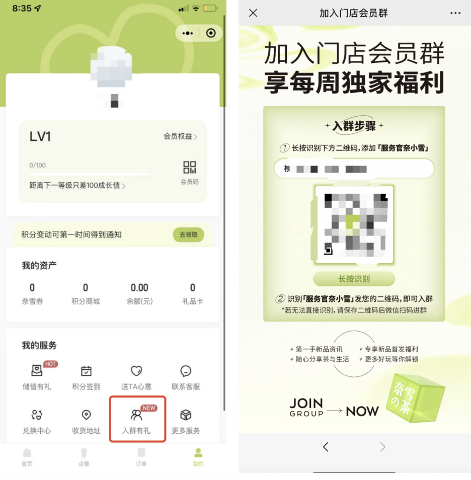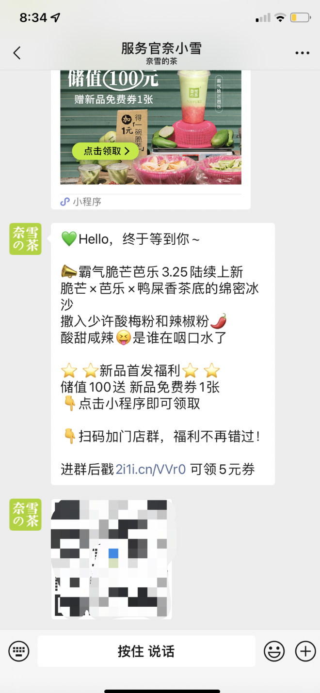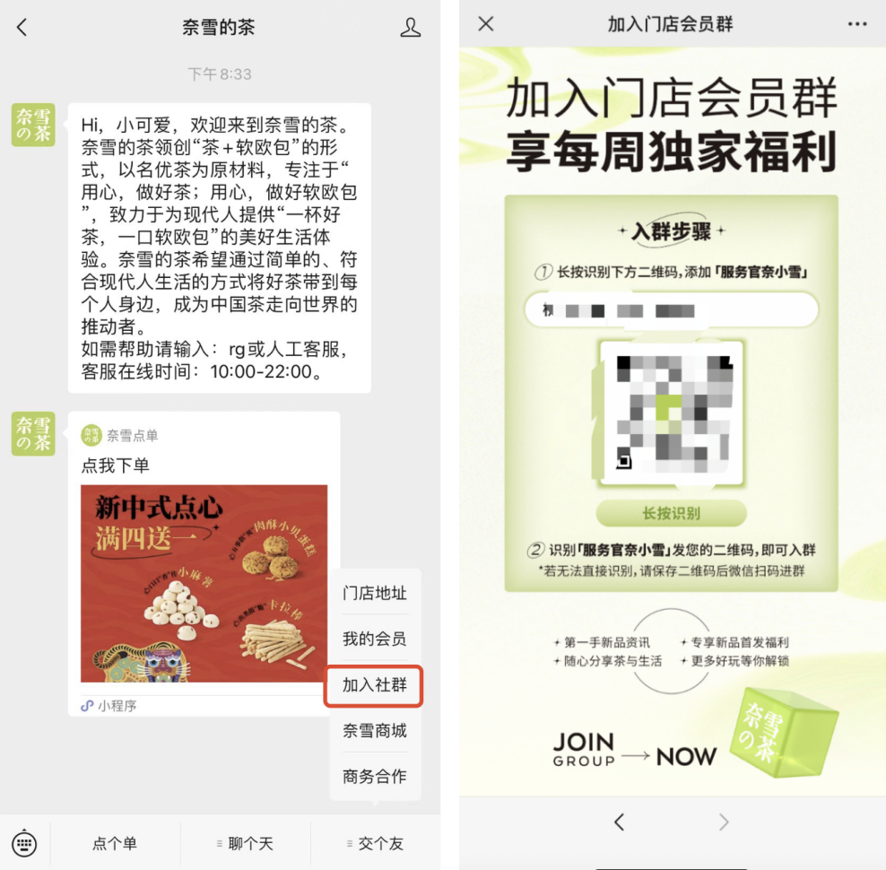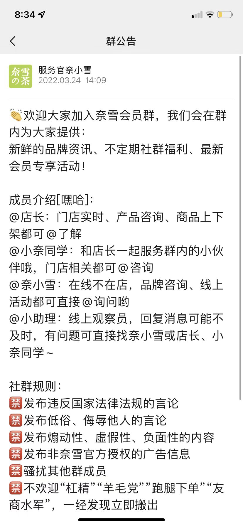 新用戶:邀請(qǐng)至專有的新客群,在社群運(yùn)營(yíng)中針對(duì)性地多推送奈雪的品牌故事,滿足新客希望了解更多相關(guān)信息的訴求。