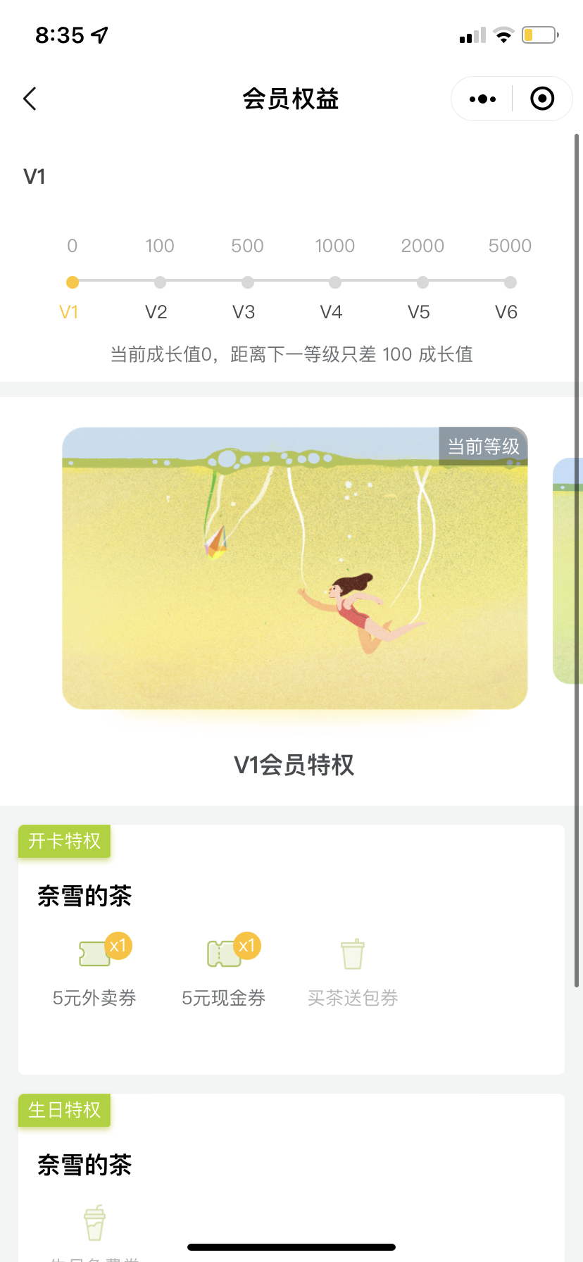 v1(0-99):5元外賣券*1、5元現(xiàn)金券*1 v2(100-499):5元外賣券*1、5元現(xiàn)金券*1、生日免費(fèi)券*1 v3(500-999):5元外賣券*1、5元現(xiàn)金券*1、生日免費(fèi)券*1、活動(dòng)優(yōu)先報(bào)名權(quán)*1 v4(1000-1999):5元外賣券*1、5元現(xiàn)金券*1、生日免費(fèi)券*1、活動(dòng)優(yōu)先報(bào)名權(quán)*1 v5(2000-4999):5元外賣券*2、5元現(xiàn)金券*2、生日免費(fèi)券*1、活動(dòng)優(yōu)先報(bào)名權(quán)*1、新品品鑒會(huì)*1 v6(5000以上):5元外賣券*2、5元現(xiàn)金券*2、生日免費(fèi)券*1、活動(dòng)優(yōu)先報(bào)名權(quán)*1、新品品鑒會(huì)*1、線下體驗(yàn)活動(dòng)*1、不定期新品體驗(yàn)券*1