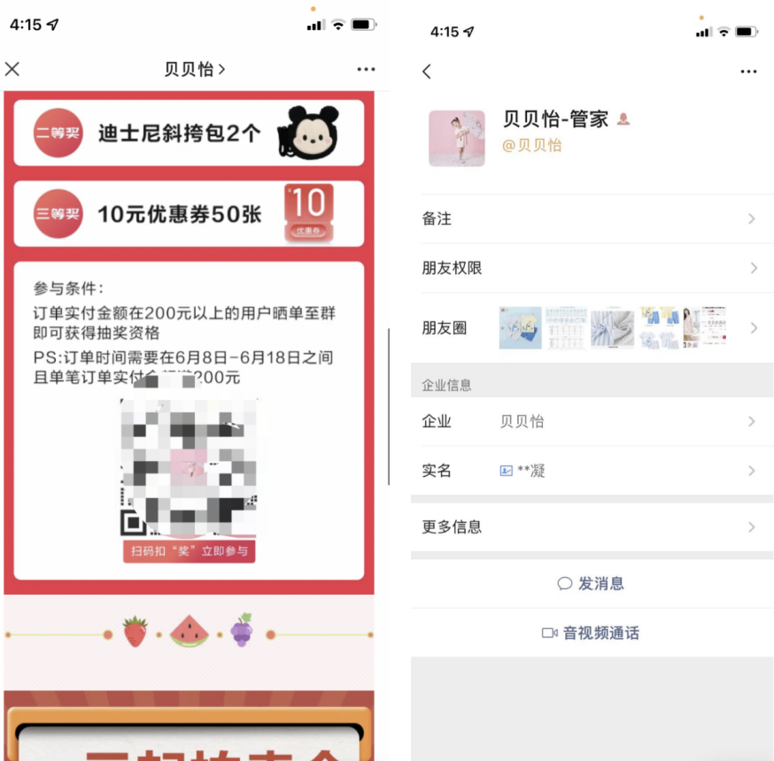 貝貝怡的員工微信采用統(tǒng)一的前綴“貝貝怡-xxx”,例如貝貝怡-小鯨魚、貝貝怡-福利官。