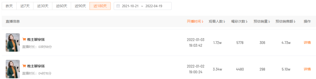 剛開(kāi)始做視頻號(hào)的時(shí)候,從視頻拍攝到直播間的售后客服,全部由喬教主自己一人扛下了所有。在沒(méi)有完全確定之下,她不敢貿(mào)然加入更多的人力。但在穩(wěn)扎穩(wěn)打的堅(jiān)持之下,形象搭配師喬教主的直播間也有了穩(wěn)步的增長(zhǎng)。我們從友望數(shù)據(jù)的【直播記錄】中可以看到,在今年年初時(shí)候,喬教主的直播間觀看人數(shù)大概在1-3萬(wàn)左右,銷售業(yè)績(jī)也在10萬(wàn)以下。