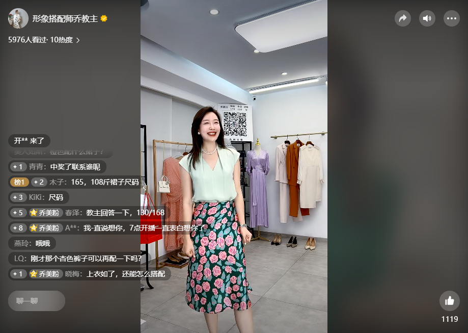 每天晚上7點(diǎn),喬教主帶著精心挑選、搭配的貨品,準(zhǔn)時(shí)在形象搭配師喬教主直播間與大家見(jiàn)面。在直播間,可以看到喬教主像和朋友交流一樣,一邊穿著衣服,一邊給大家講解衣服的設(shè)計(jì)、面料和搭配,沒(méi)有像其他直播間“打雞血”似的激情,有的是喬教主干凈清爽的聲音與笑容以及觀眾熱情的互動(dòng)。