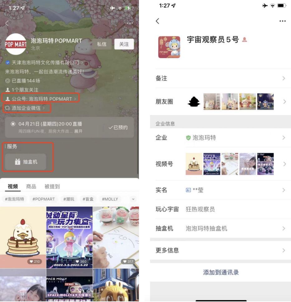 視頻號:視頻號主頁鏈接了公眾號、企業(yè)微信、小程序,三個入口均可以添加到私域。主要的視頻內(nèi)容以品牌宣傳、IP宣傳片為主。除此之外,視頻號也會不定期開啟直播,既能直播帶貨也能增強(qiáng)品牌曝光。