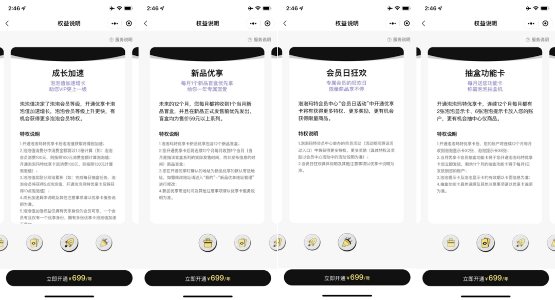 泡泡瑪特的付費(fèi)會員為699元/年,可享受新品優(yōu)享、歐氣加倍、成長加速、會員日狂歡4項權(quán)益,具體如下。