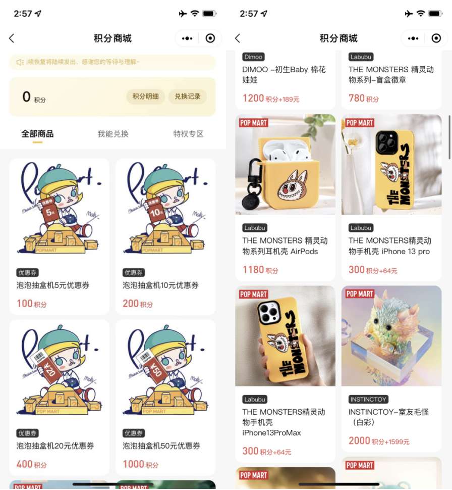 目前泡泡瑪特在微信小程序和電商平臺中有會員的體系,小程序中包含成長型會員和付費(fèi)會員,京東和天貓上只有簡單的成長型會員,兩者都擁有積分的體系。
