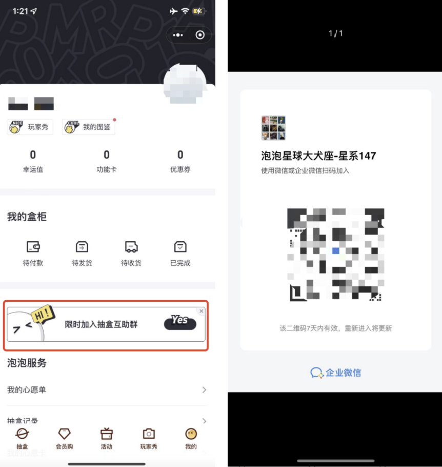 小程序:泡泡瑪特有「泡泡瑪特」、「泡泡瑪特抽盒機(jī)」兩個主要的小程序。小程序除了線上購買的功能,還承載了重要的私域引流入口。具體路徑: