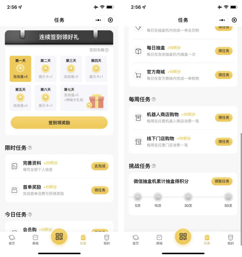 用戶消費(fèi)可獲得積分,每消費(fèi)1元積1分,另外可通過每日簽到、每日任務(wù)、限時任務(wù)、每周任務(wù)和挑戰(zhàn)任務(wù)來獲取積分。