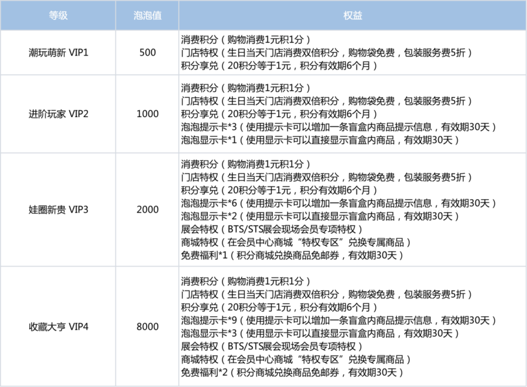 泡泡瑪特按照泡泡值將用戶分為4個等級,具體權(quán)益如下: