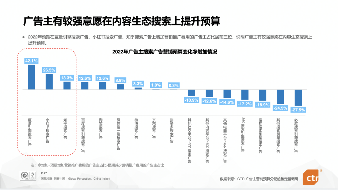 截止去年8月,今日頭條和抖音日總搜索PV達5億,去年一整年,用戶內(nèi)容搜索行為增長238%,熱點搜索行為增長171%,搜索廣告的流量價值目前來看還在持續(xù)攀升階段,遠沒有見頂。(*數(shù)據(jù)來源:CTR廣告主營銷預(yù)算分配趨勢定量調(diào)研 2022年01月 )