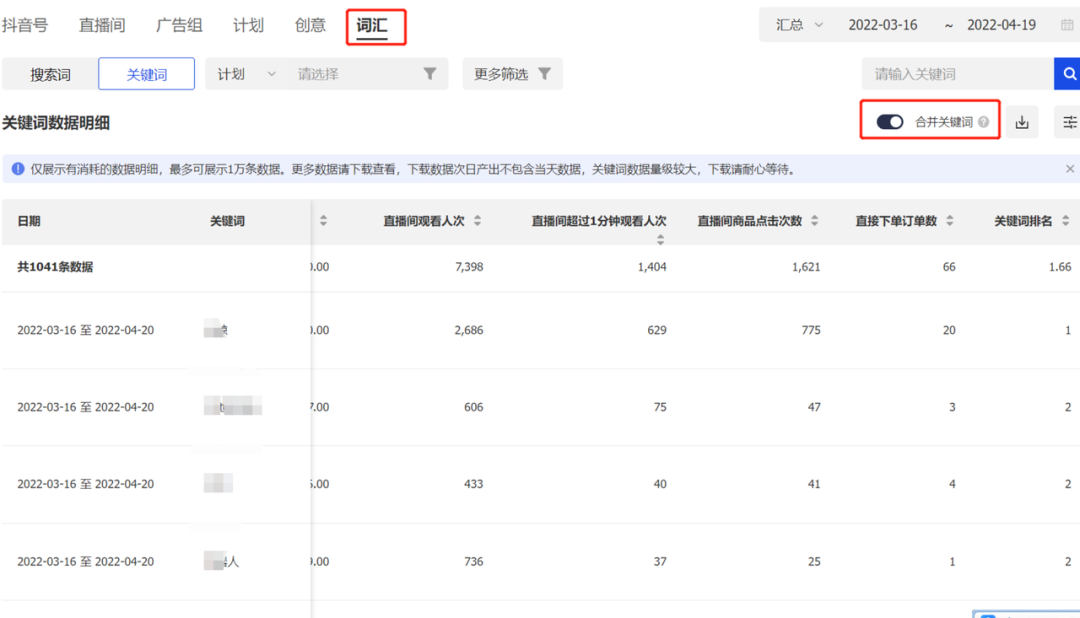 落地到操作上,我們可以先打開后臺的報表,選擇詞匯,把關(guān)鍵詞合并,看的更直觀。