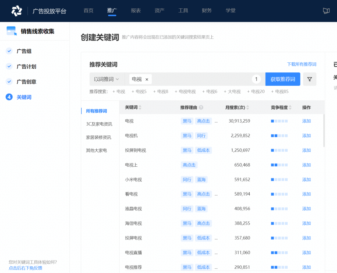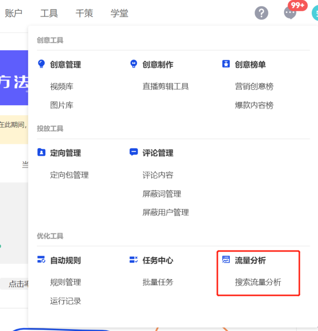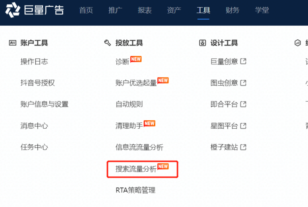 針對關(guān)鍵詞分類,推薦用【巨量引擎廣告投放平臺】的投放工具,來幫助我們的賬戶添加足夠能跑量的關(guān)鍵詞。這里簡單介紹兩個工具,一個是以詞推詞,一個是搜索流量分析工具。