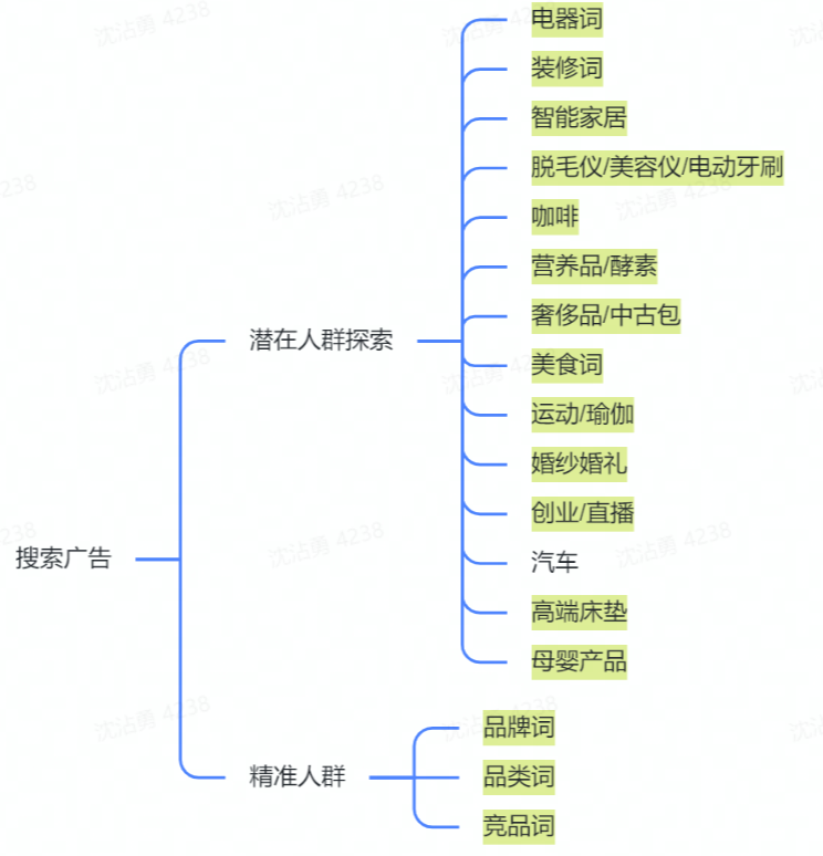 做搜索廣告,核心就是關(guān)鍵詞,必須做好關(guān)鍵詞的優(yōu)化,但如果只是在我們搭建計劃的時候使用計劃默認推薦的詞包,一定會存在流量的局限,而且對新直播間來說,整體投放效果不可把控。所以在開始投放之前,我們要對投放的關(guān)鍵詞進行以下分類: