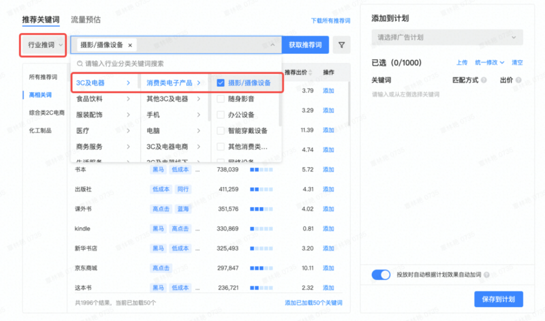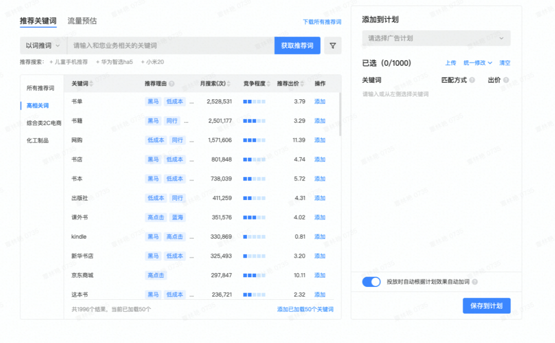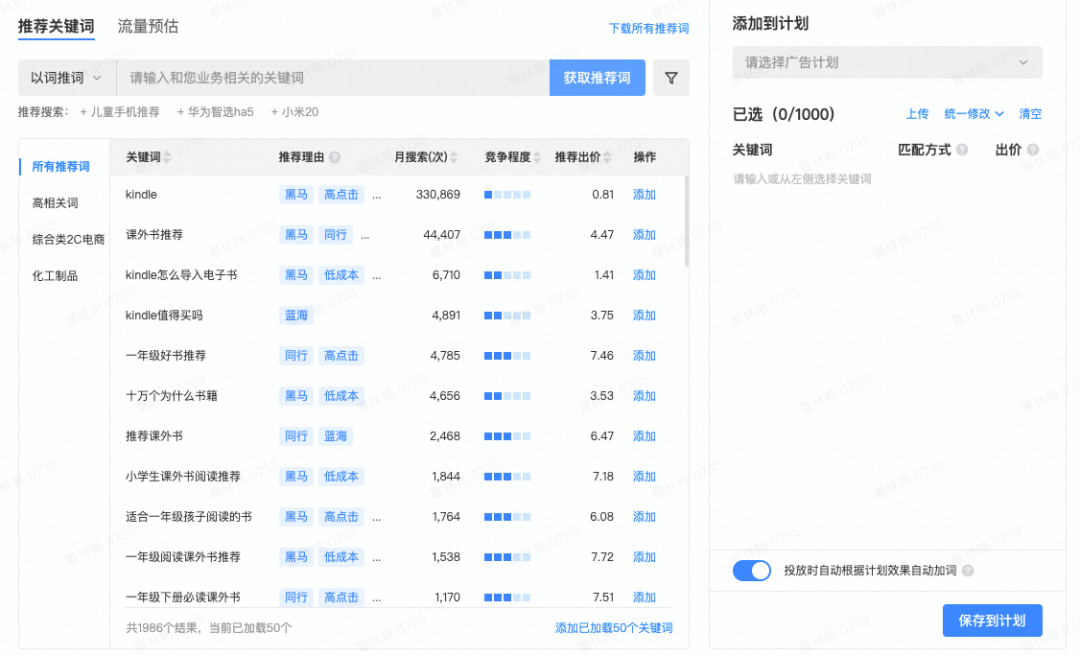 在搭建搜索計劃的時候,可以選擇以詞推詞的方式增加我們想要的關(guān)鍵詞。這里就是檢驗我們前邊關(guān)鍵詞分類功課做的是否合格的地方,前邊關(guān)鍵詞分類做的好,通過以詞推詞,效果加倍。