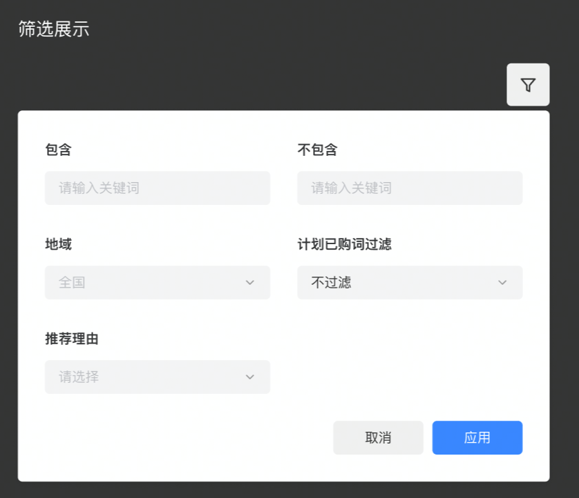 接下來可以通過點擊篩選框進行篩選關(guān)鍵詞。篩選粒度很細致,可以滿足我們對詞的選擇的多種需要。