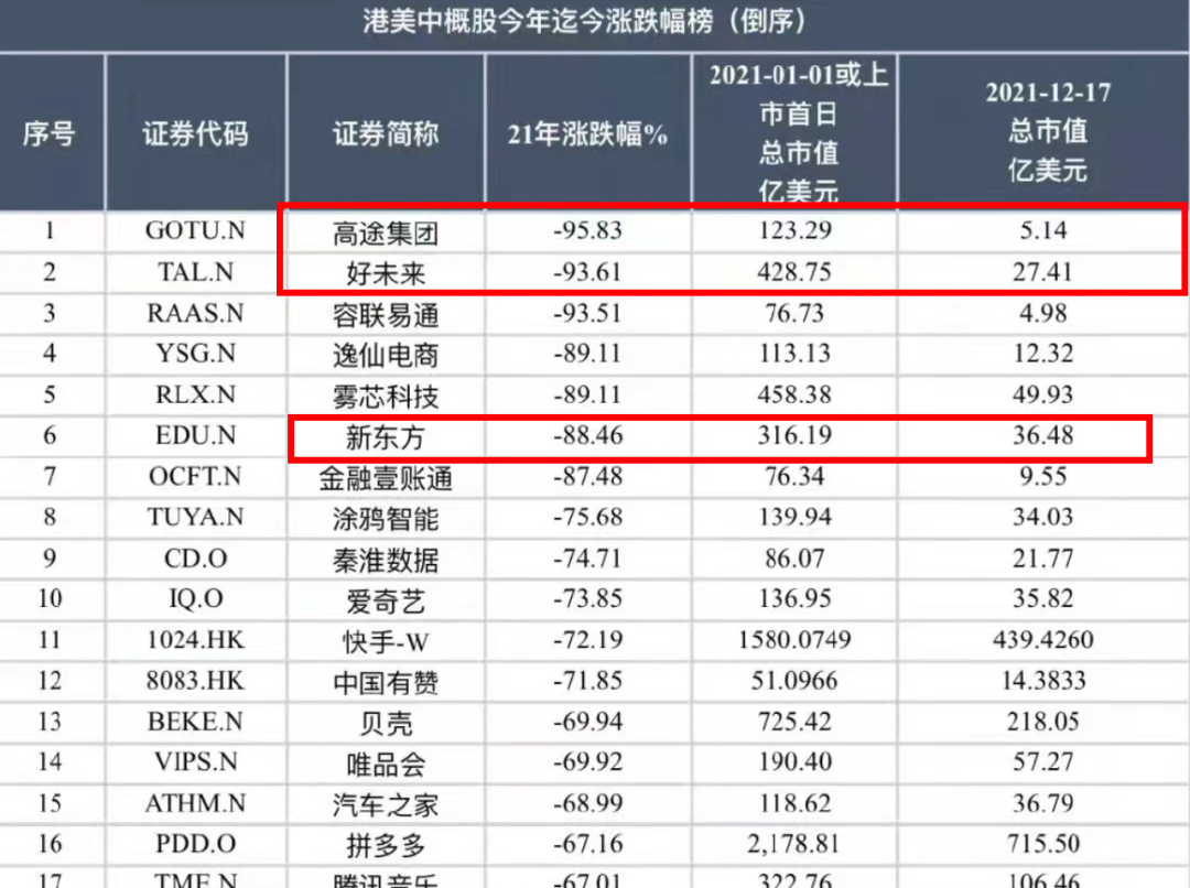 毫無(wú)疑問(wèn),雙減政策公布實(shí)施后,整個(gè) 2021 年下半年,教育公司們的日子都不好過(guò)。不僅大規(guī)模裁員,各大教育公司股價(jià)也皆呈現(xiàn)暴跌趨勢(shì)。可以說(shuō)是,整個(gè)教育行業(yè)都在“過(guò)冬”。一張由鳳凰網(wǎng)科技整理的“港美中概股今年迄今漲跌幅榜”,跌幅排名前十的公司中,有三家企業(yè)為教培機(jī)構(gòu)。其中高途(GOTU.US)以 95.83% 的跌幅位居第一;好未來(lái)位居第二,跌幅為 93.61%;新東方(EDU.US)則以 88.46% 的跌幅位列第六。