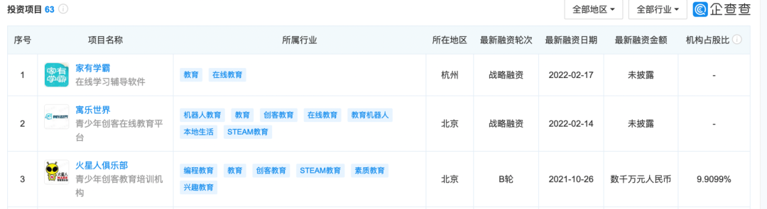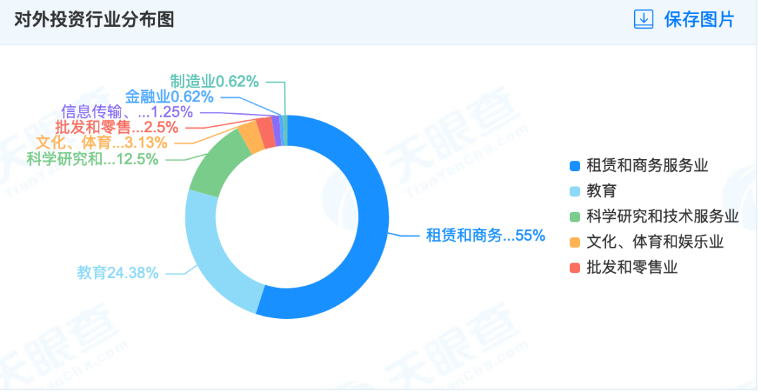 新東方還不斷通過(guò)投資來(lái)擴(kuò)張業(yè)務(wù)版圖,其對(duì)外投資項(xiàng)目涉及了“租賃、商務(wù)服務(wù)業(yè)、教育、科學(xué)研究、技術(shù)服務(wù)、文體娛樂(lè)、批發(fā)零售”等多個(gè)類(lèi)目,其中,教育排名第二,占比達(dá)到 24.38%。雙減后,新東方的最新投資也是三個(gè)教育相關(guān)的產(chǎn)品,分別涉及 Steam 教育和教學(xué)線(xiàn)上互動(dòng)工具。除了教育類(lèi)項(xiàng)目之外,新東方廣泛地投資了教育出版業(yè)和科技應(yīng)用領(lǐng)域。比如,新東方就于 3 月 23 日投資了一家“大愚圖書(shū)銷(xiāo)售有限公司”,進(jìn)軍出版物行業(yè)。據(jù)天眼查顯示,該企業(yè)由鄭州新東方培訓(xùn)學(xué)校有限公司全資控股,經(jīng)營(yíng)范圍包括出版物批發(fā)、零售;心理咨詢(xún)服務(wù);托育服務(wù);中小學(xué)生校外托管服務(wù);幼兒園外托管服務(wù);自費(fèi)出國(guó)留學(xué)中介服務(wù);餐飲管理;電競(jìng)賽事策劃等。
