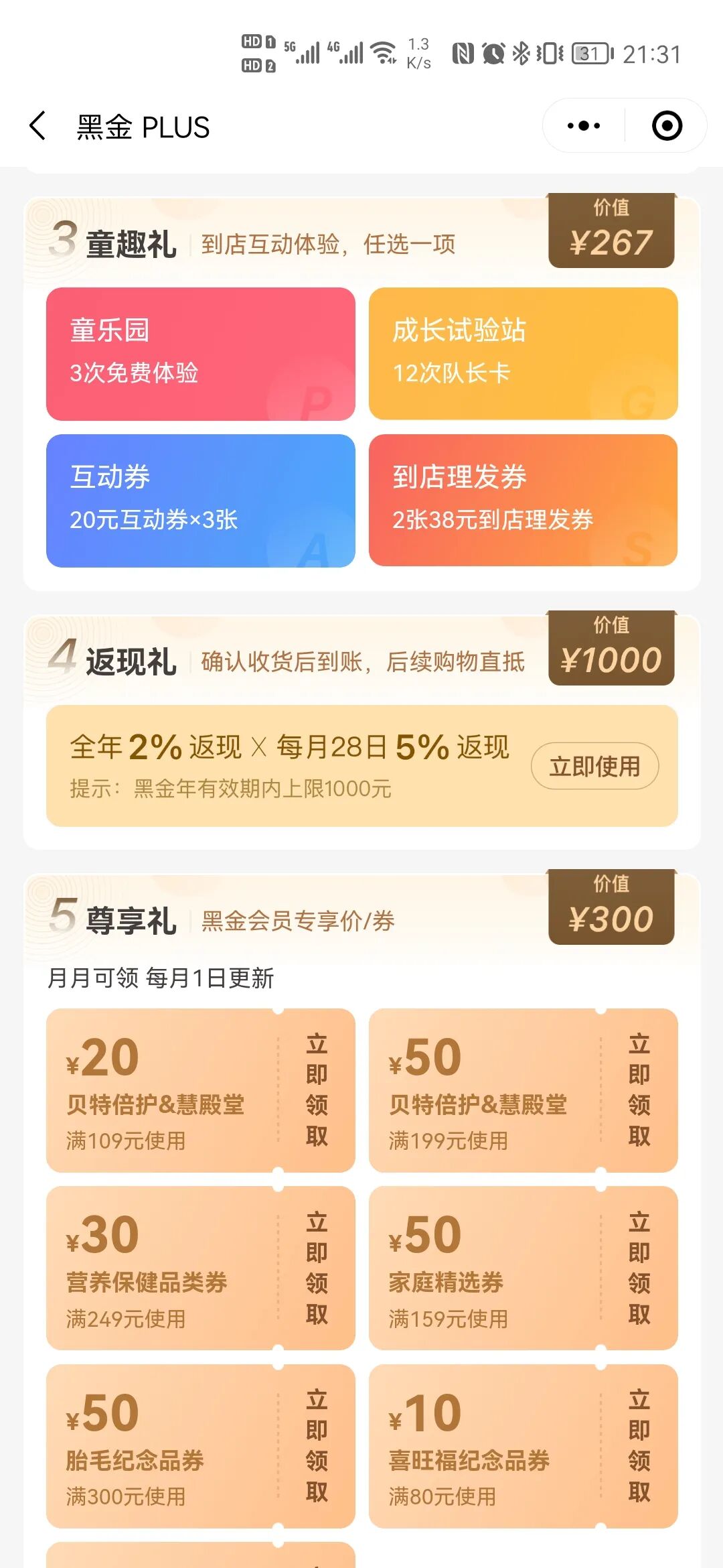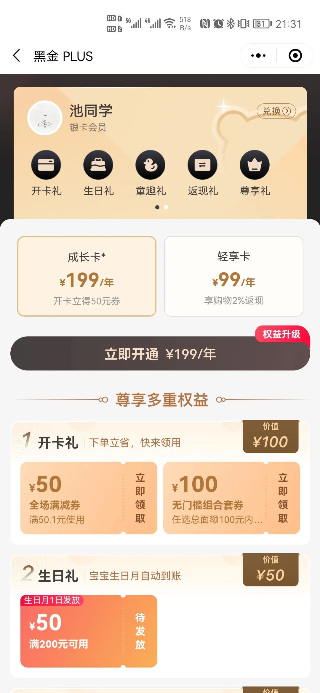 我們重點看下199成長卡獨有的三項權(quán)益“開卡禮”、“生日禮”、“童趣禮”。