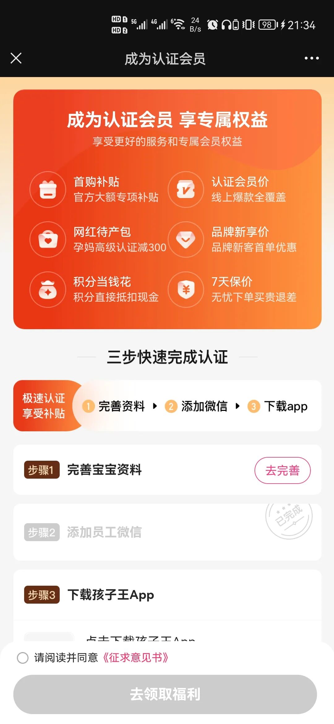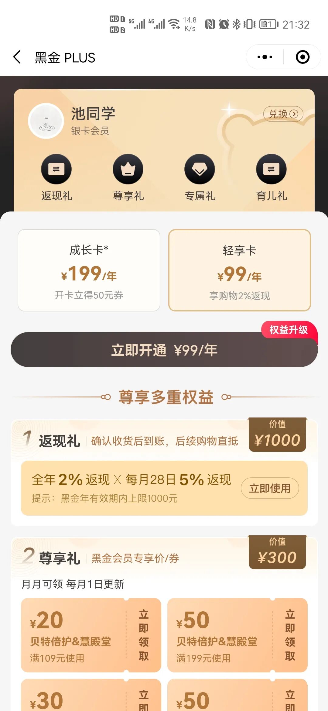 成長卡比輕享卡多出來的100元,但開卡之后品牌就將這部分費用以優(yōu)惠券的形式“超額”返還給用戶。