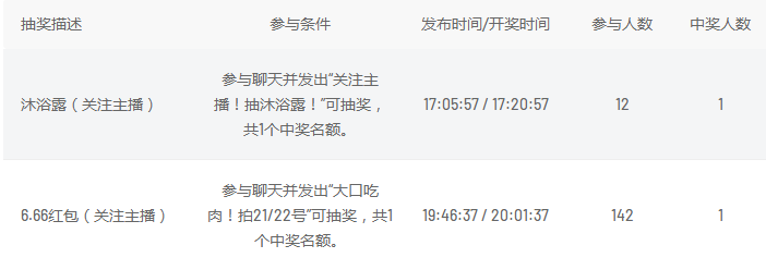 從福袋的發(fā)布時(shí)間及開獎(jiǎng)時(shí)間可以發(fā)現(xiàn)整場直播下來,福袋幾乎沒斷過。
