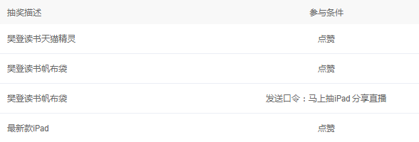 有的直播間會(huì)在固定一個(gè)時(shí)間段送福袋,每隔半個(gè)小時(shí)或1個(gè)小時(shí)抽獎(jiǎng)一次,有的甚至福袋抽獎(jiǎng)貫穿整個(gè)直播間,福利送不停。比如在監(jiān)控樊登讀書的一場寵粉節(jié)直播中,有iPad、iPhone13、馬克杯、帆布袋、1000元的圖書盲盒等豐厚獎(jiǎng)品,參與條件有評論任意內(nèi)容、點(diǎn)贊、分享。