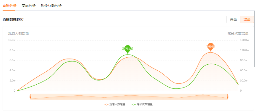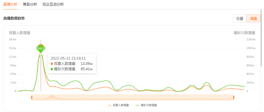 豐厚的獎(jiǎng)品福利活躍直播間的同時(shí),也很好地為直播間引流,從【直播數(shù)據(jù)趨勢】可以了解到該場直播喝彩次數(shù)增量在21點(diǎn)13分達(dá)到峰值,超過100w,觀看人數(shù)增量在22點(diǎn)24分達(dá)到峰值,達(dá)到了7.6w。