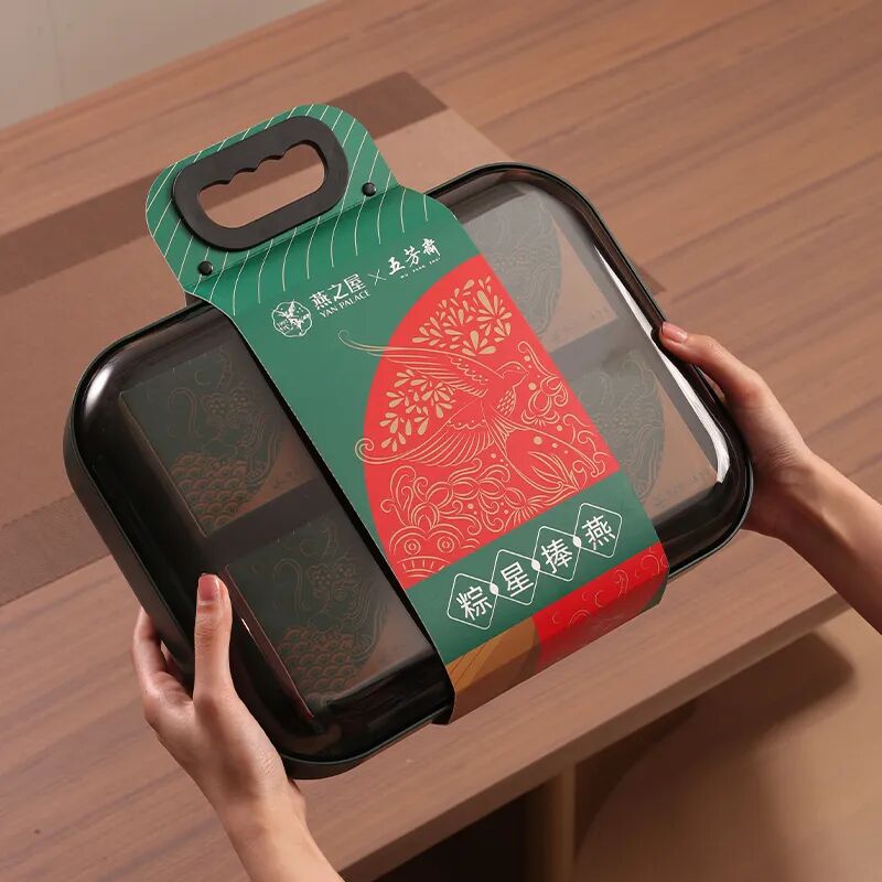 首先,從名字的寓意來(lái)看,燕之屋x五芳齋以“眾星捧月”為靈感,為聯(lián)名款取名“粽星捧燕”,傳達(dá)了星星守護(hù)月亮,恰如擁護(hù)珍視之人的美好寓意。另外包裝的設(shè)計(jì)也頗具巧思,將“粽星捧燕”的內(nèi)涵詮釋得淋漓盡致。在外盒包裝上,燕之屋采用展翅飛翔的燕子作為主形象,輔以中國(guó)古代傳統(tǒng)窗花元素點(diǎn)綴,形成“萬(wàn)綠叢中一點(diǎn)紅”之畫意。