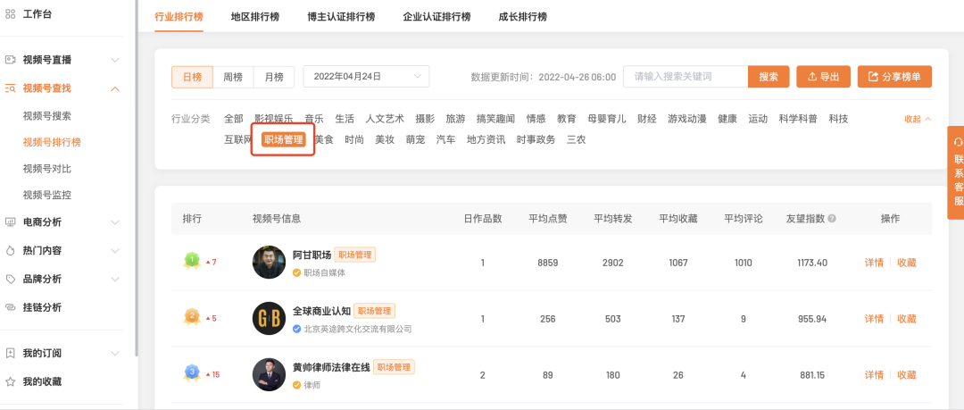 在新視、友望數(shù)據(jù)等視頻號數(shù)據(jù)分析平臺上,我們可以通過行業(yè)分類篩選賬號,也可以直接搜索關鍵詞找賬號。