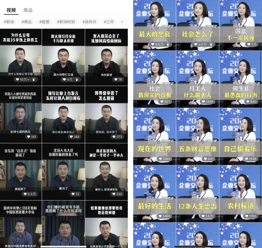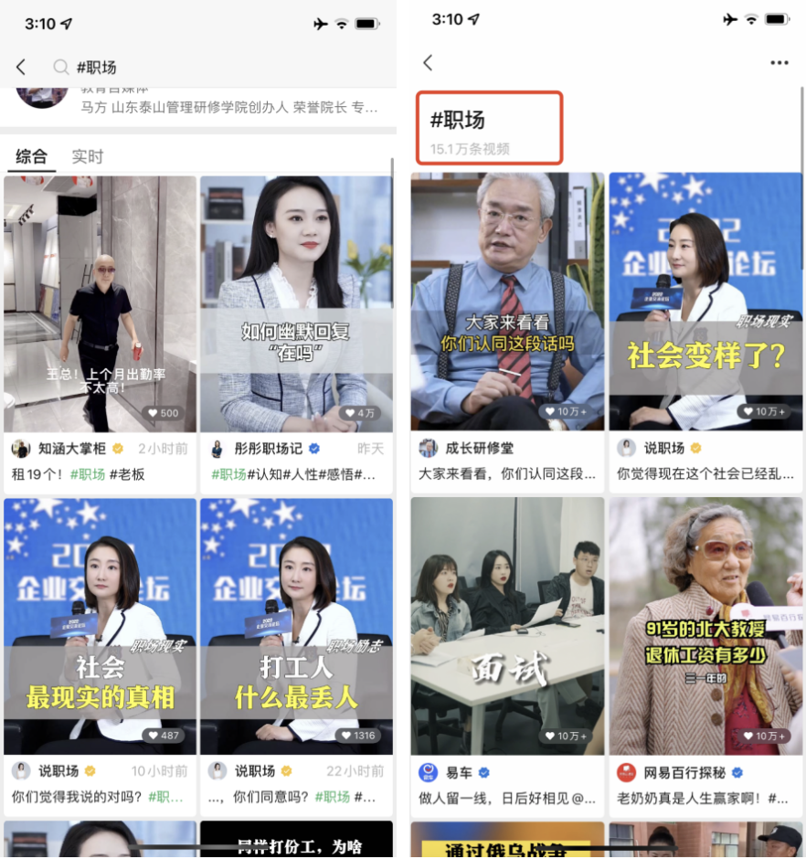 視頻號有標簽功能,同一標簽下一般都是同一領域的內(nèi)容。我們可以直接搜索「#職場」,然后在下方的視頻里點開職場這一標簽。