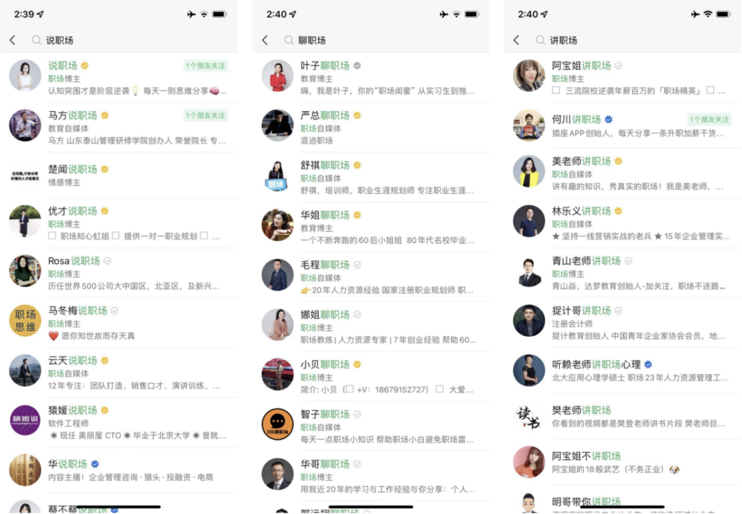 這里有個小技巧,如果想要搜索更為精準的賬號,直接在關鍵詞前面加「聊」、「說」、「講」,例如搜索「說職場」等等。