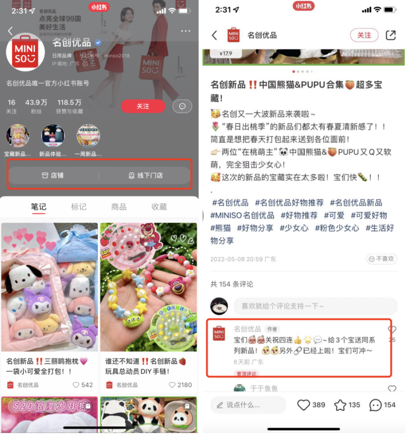 名創(chuàng)優(yōu)品的小紅書主頁掛了店鋪的鏈接和線下門店入口,此外在產(chǎn)品種草的筆記里,在評論區(qū)也引導用戶下單購買。
