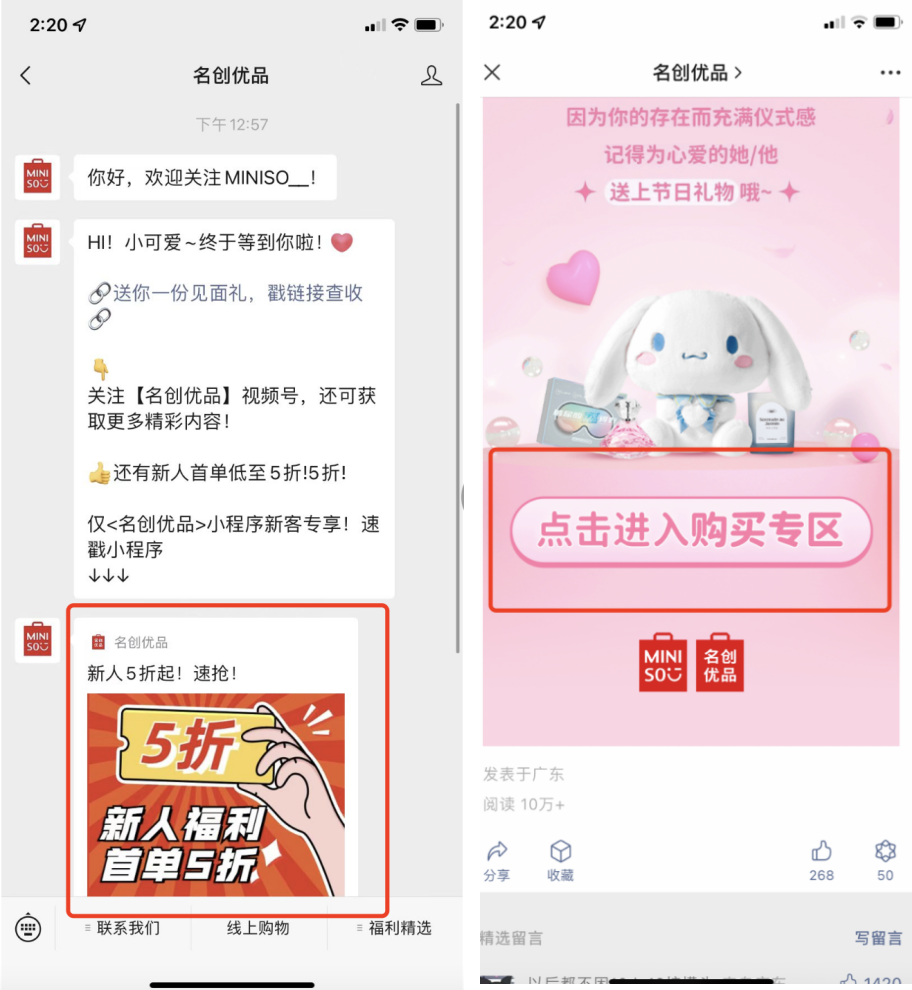 在關注名創(chuàng)優(yōu)品的公眾號后,會第一時間發(fā)送福利鏈接,引導用戶進入商場購買。另外在公眾號推文文末會引導用戶進入商城下單。