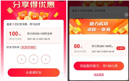 只要你請到 3 個好友幫助自己助力,你就能夠得到一張“滿200-100”半價券,幫你助力的好友也能得到一張“滿200-80”的大額券。