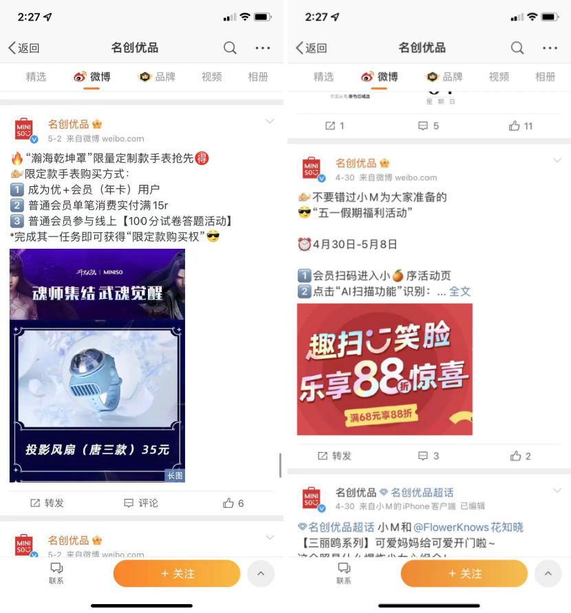 在微博上名創(chuàng)優(yōu)品會通過各種福利活動,引導用戶進行復購。