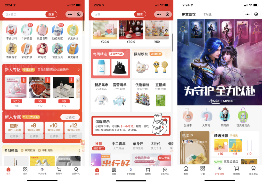 在名創(chuàng)優(yōu)品的小程序主頁里,放置了新人專屬禮包和限時秒殺等窗口,引導用戶購買。此外還有IP文創(chuàng)專區(qū),吸引更多層次的用戶下單購買。