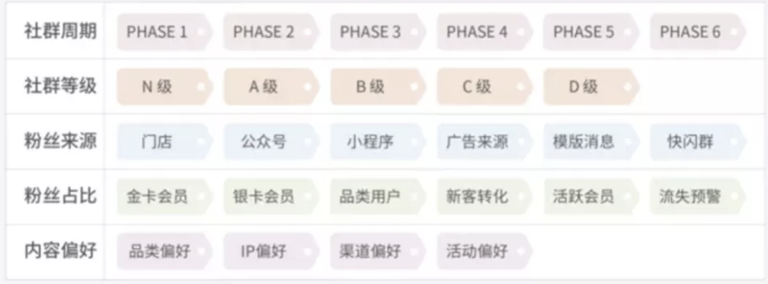 名創(chuàng)優(yōu)品總結出5大維度超過60+社群標簽組合,比如社群周期、社群等級、粉絲來源、粉絲占比、內容偏好等??梢葬槍Σ煌挠脩羧后w,做針對性的內容和活動的觸達,實現(xiàn)精準營銷。